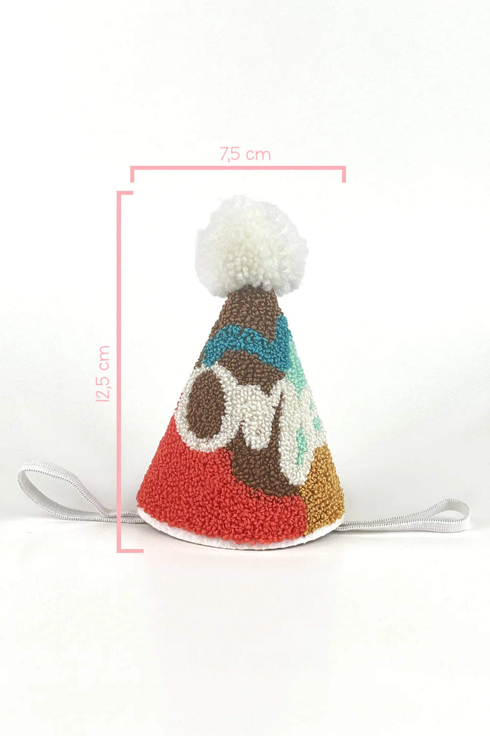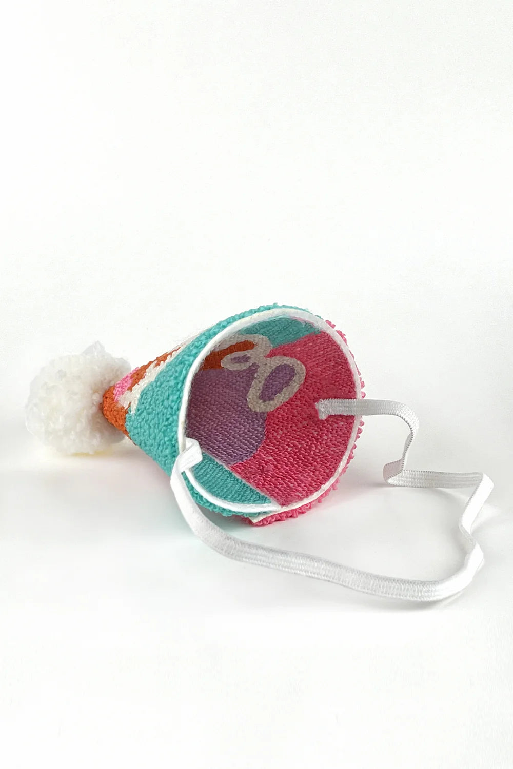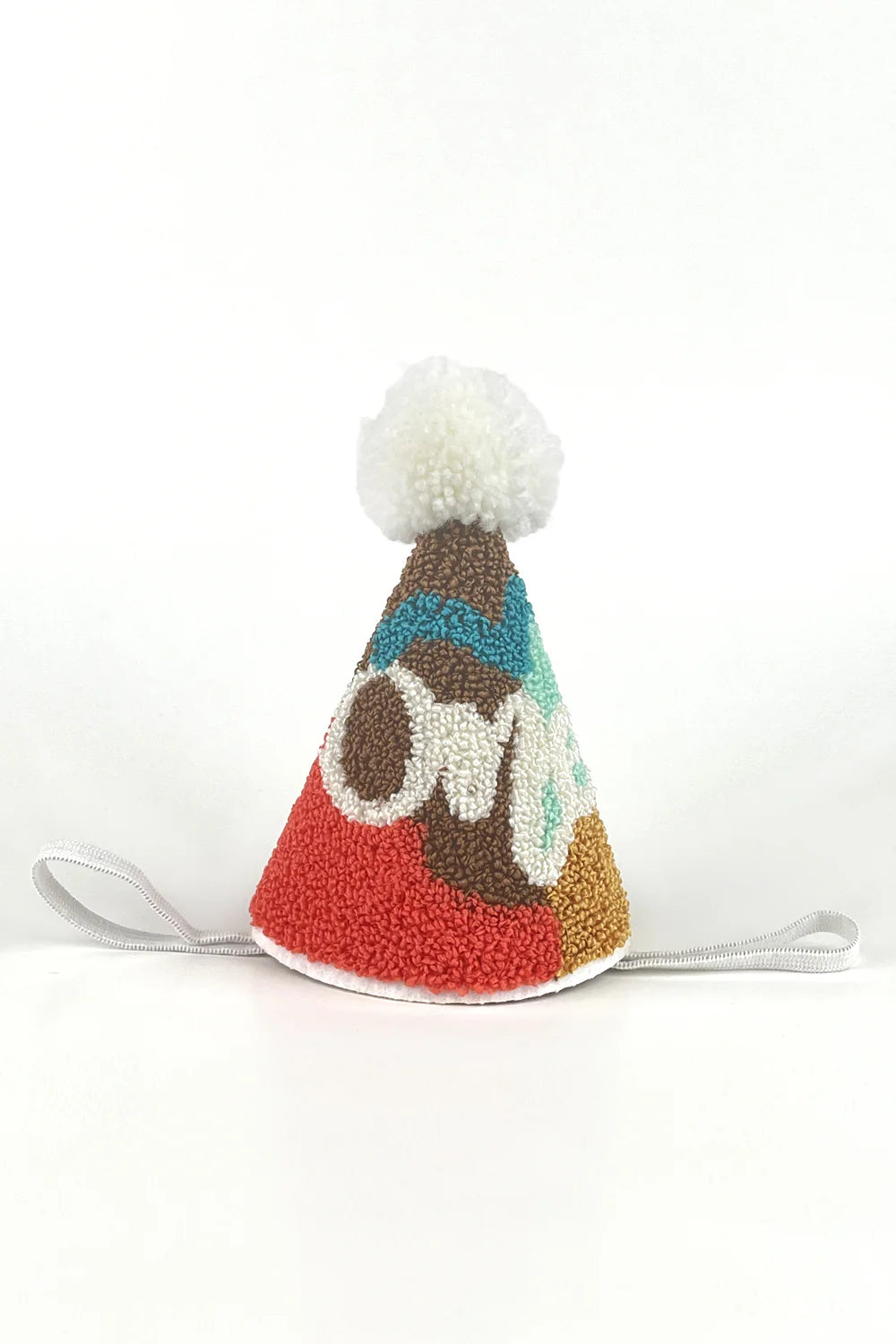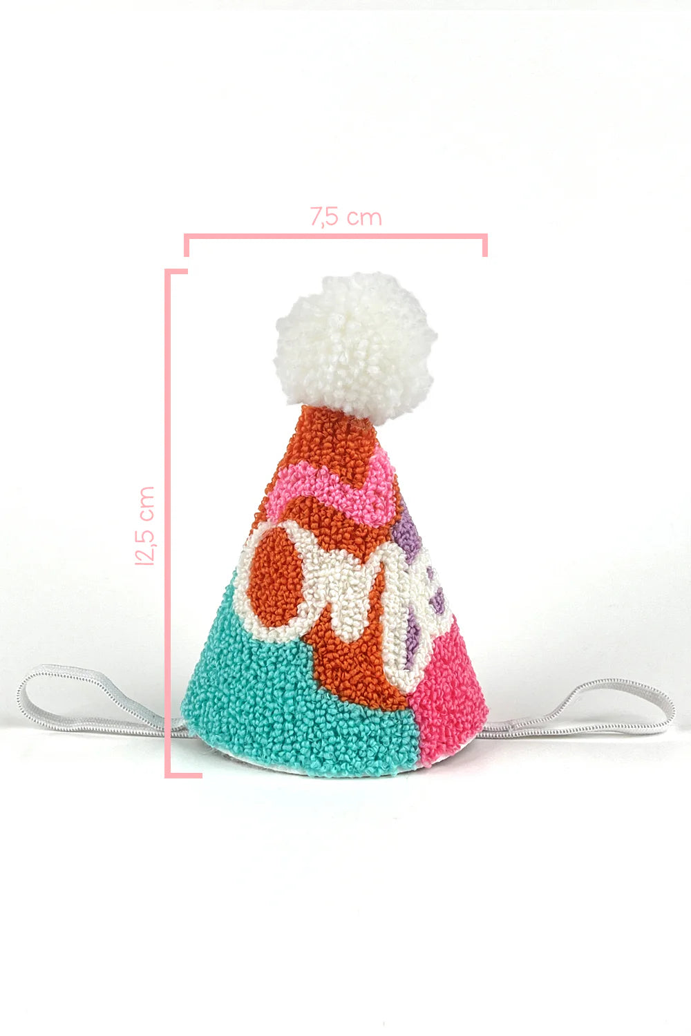 A playful and colorful birthday crown made with textured tufted fabric and topped with a fluffy pom-pom. Features the word "One" in soft yarn lettering, making it perfect for first birthdays. Lightweight, soft, and comfortable, with an elastic strap to fit little heads securely.