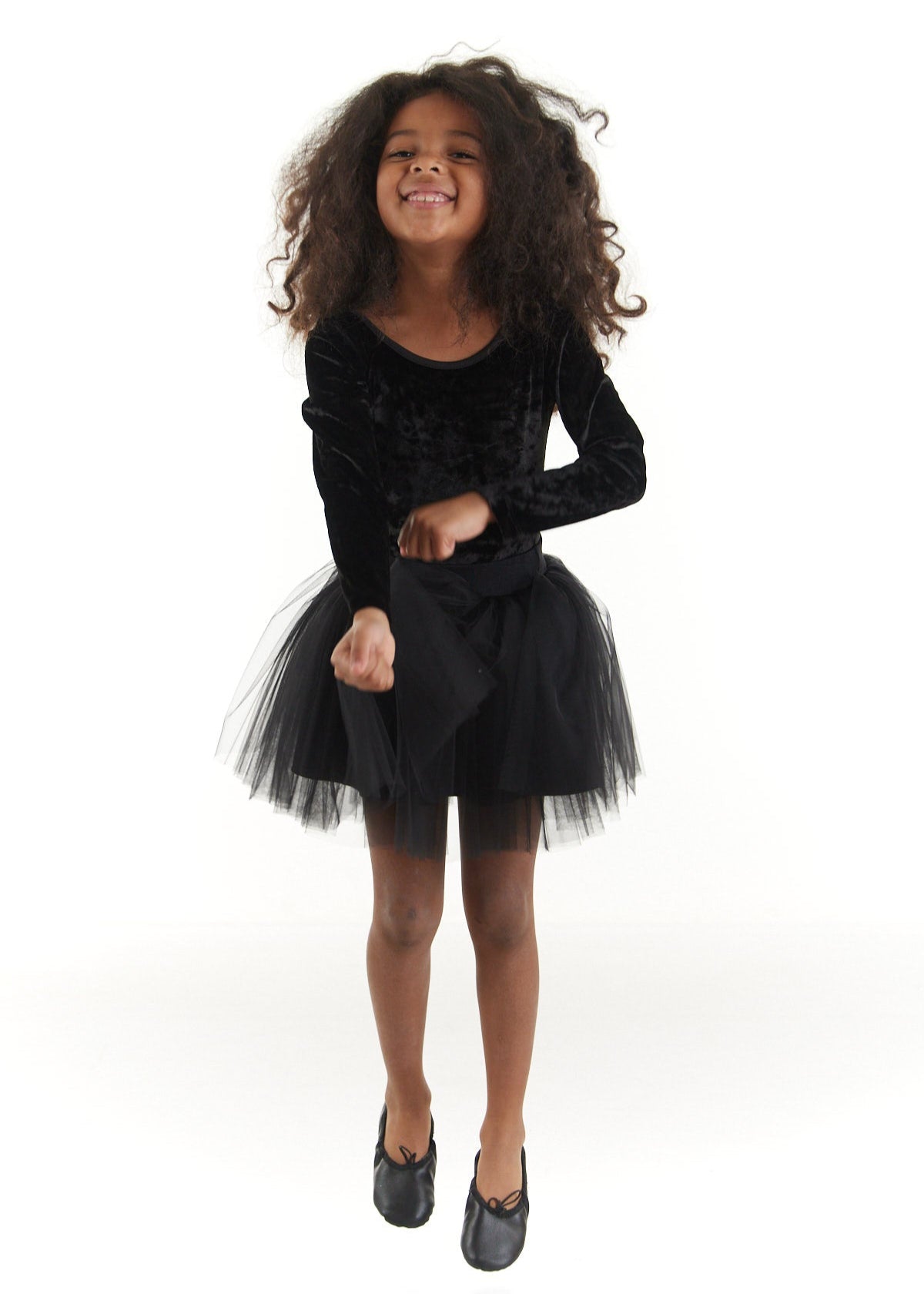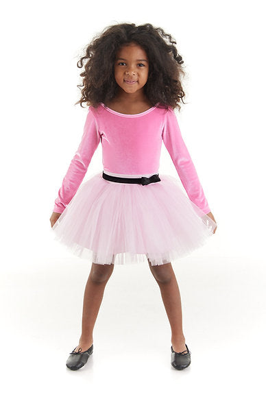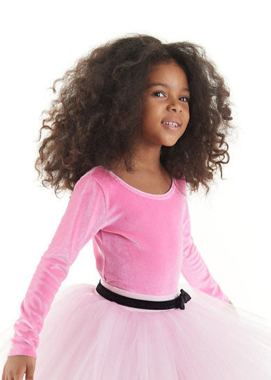 Designed for little ballerinas, this black & pink velvet bodysuit is a timeless piece that combines luxury, comfort, and versatility. Crafted from soft, black velvet with just the right amount of stretch, it ensures a snug yet flexible fit for all-day wear.